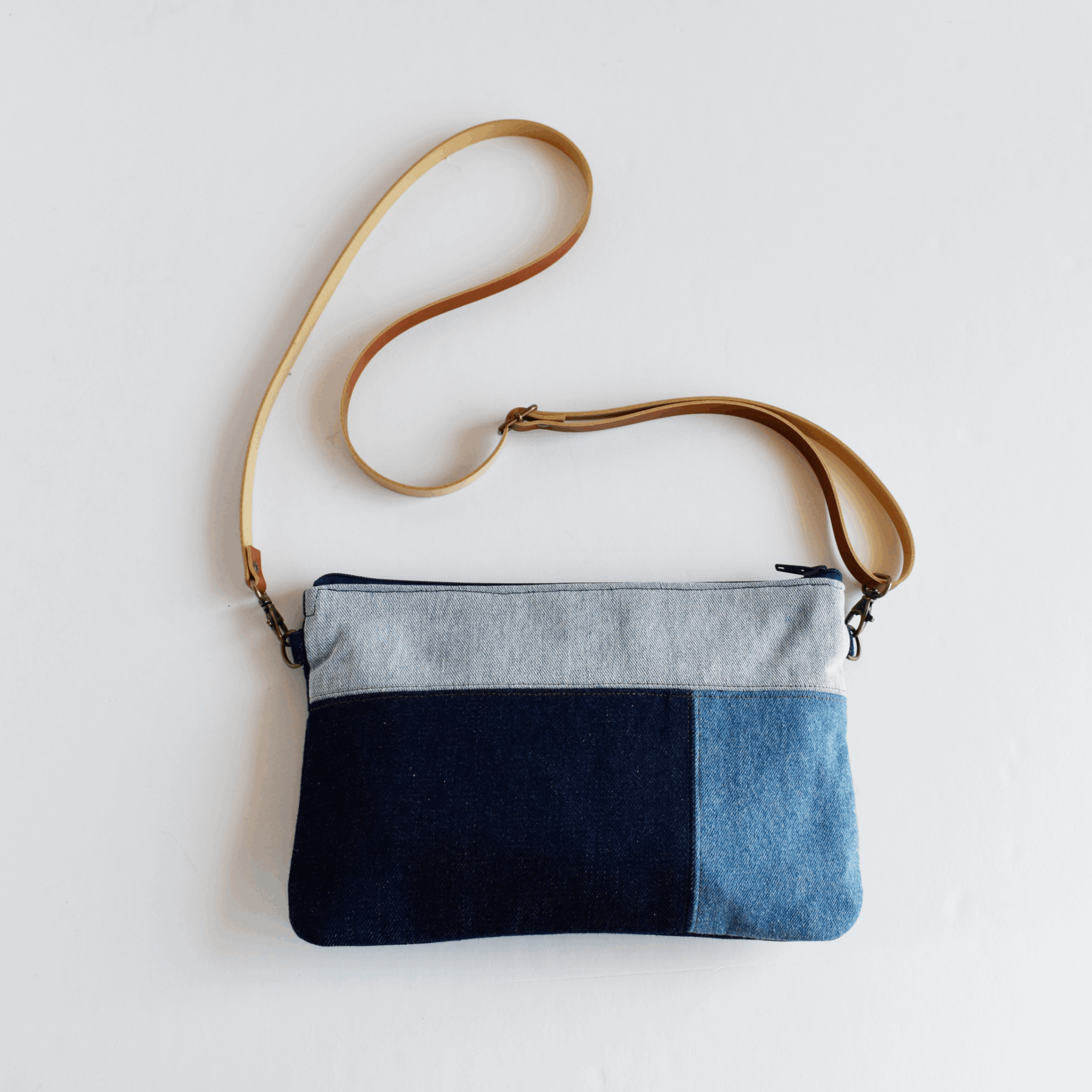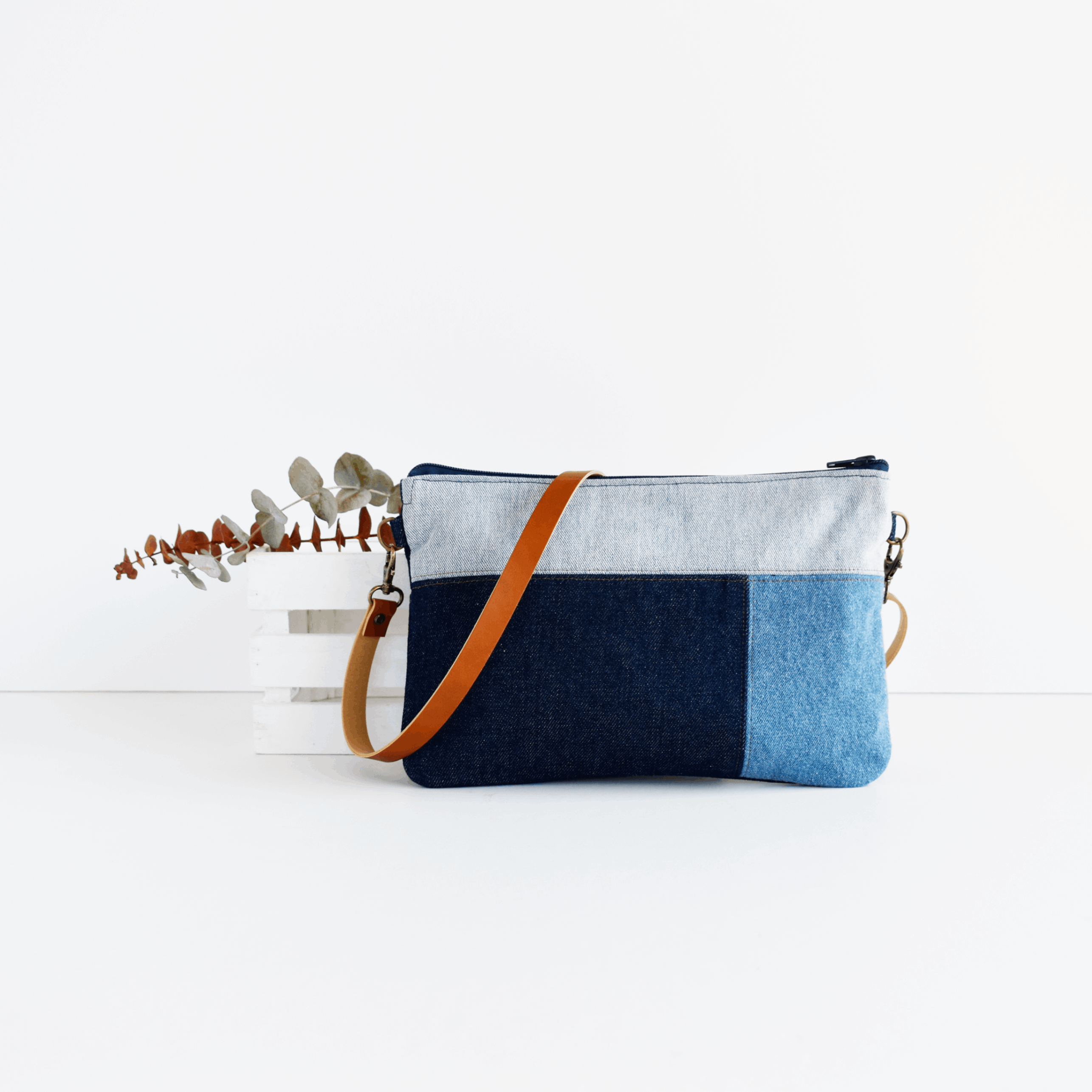 Bolso bandolera pequeño para mujer hecho a mano con una original combinación de tejidos vaqueros. Pequeño y ligero para tus imprescindibles, con múltiples bolsillos para que resulte más práctico. Un bolso cruzado de estilo informal para el día a día.