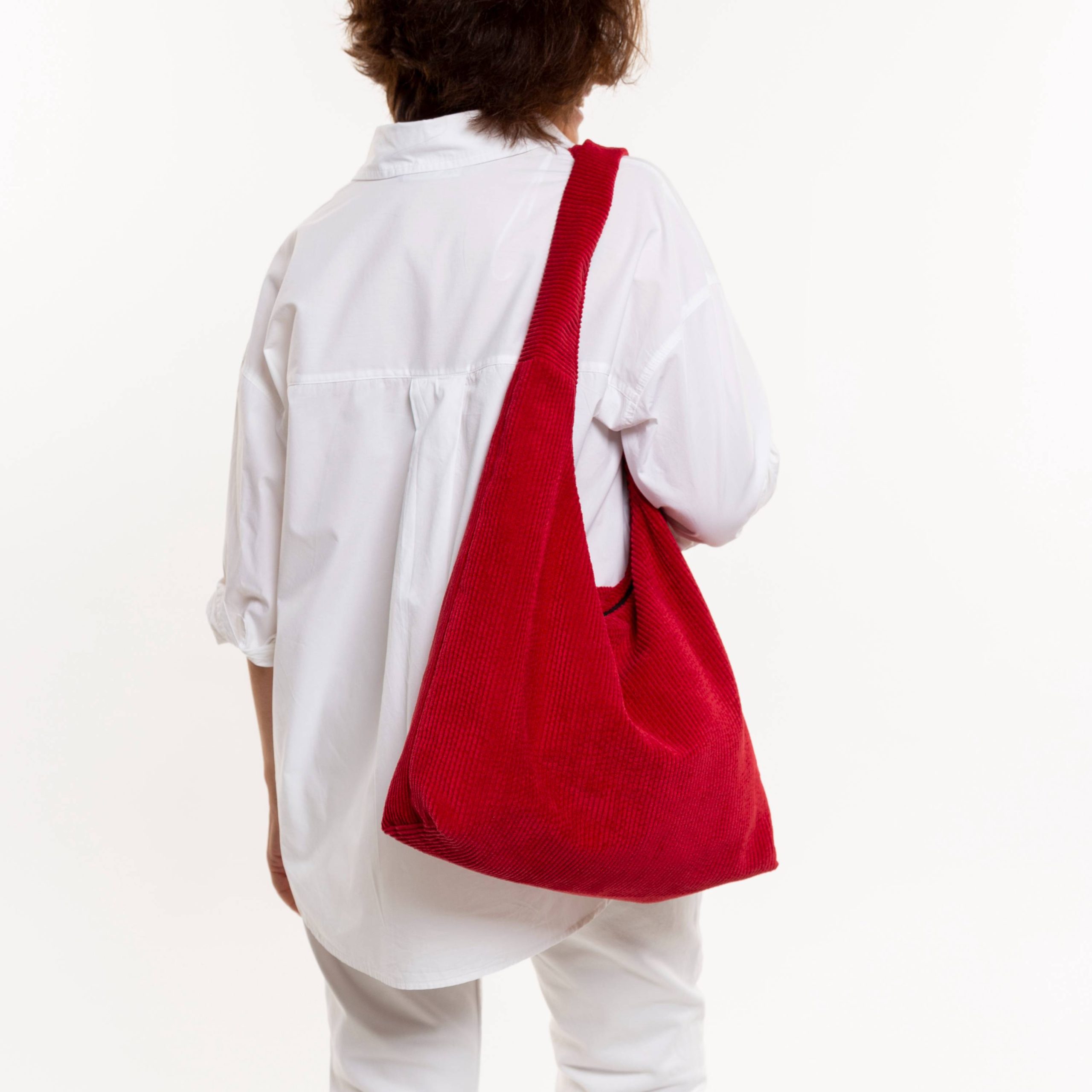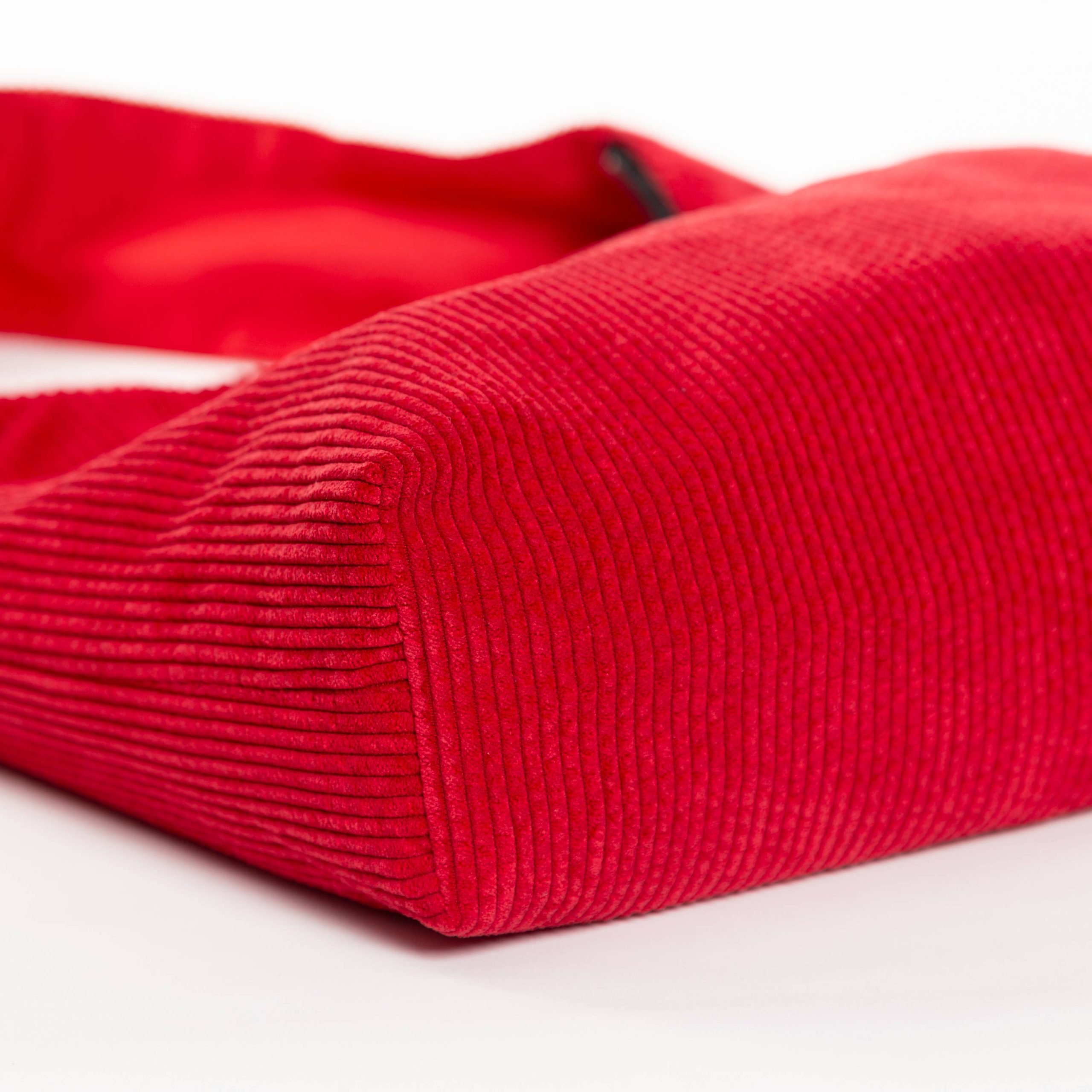 Bolso hobo para mujer hecho a mano con un tejido de pana muy suave y con mucha caída en rojo. Es un bolso grande, ligero y flexible para llevar del hombro. Diseñado para tu día a día.