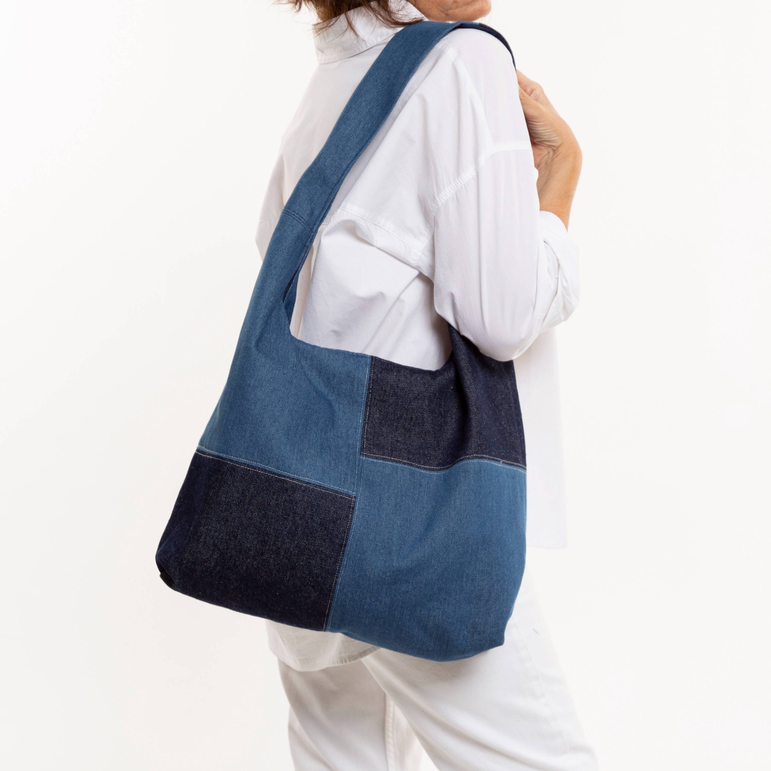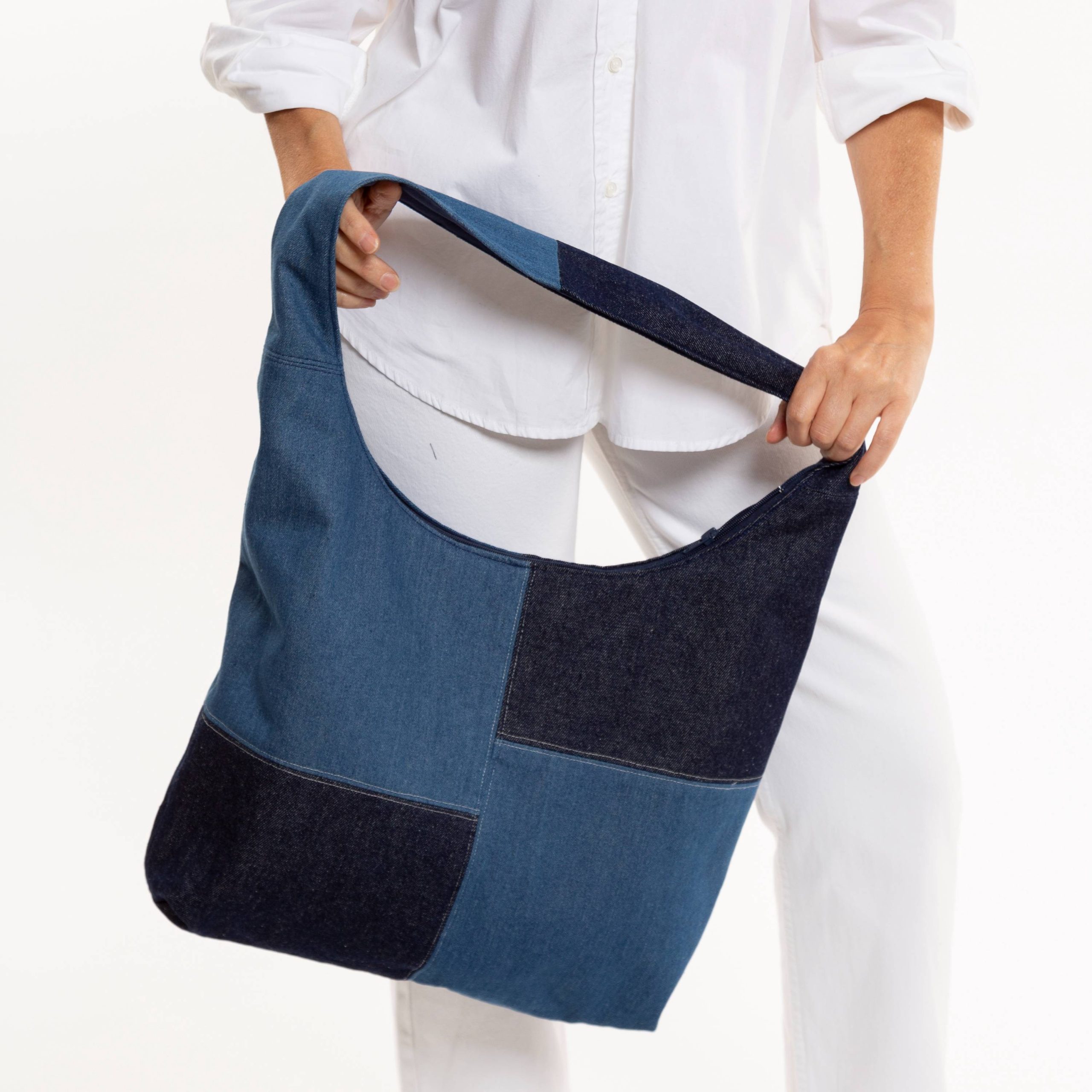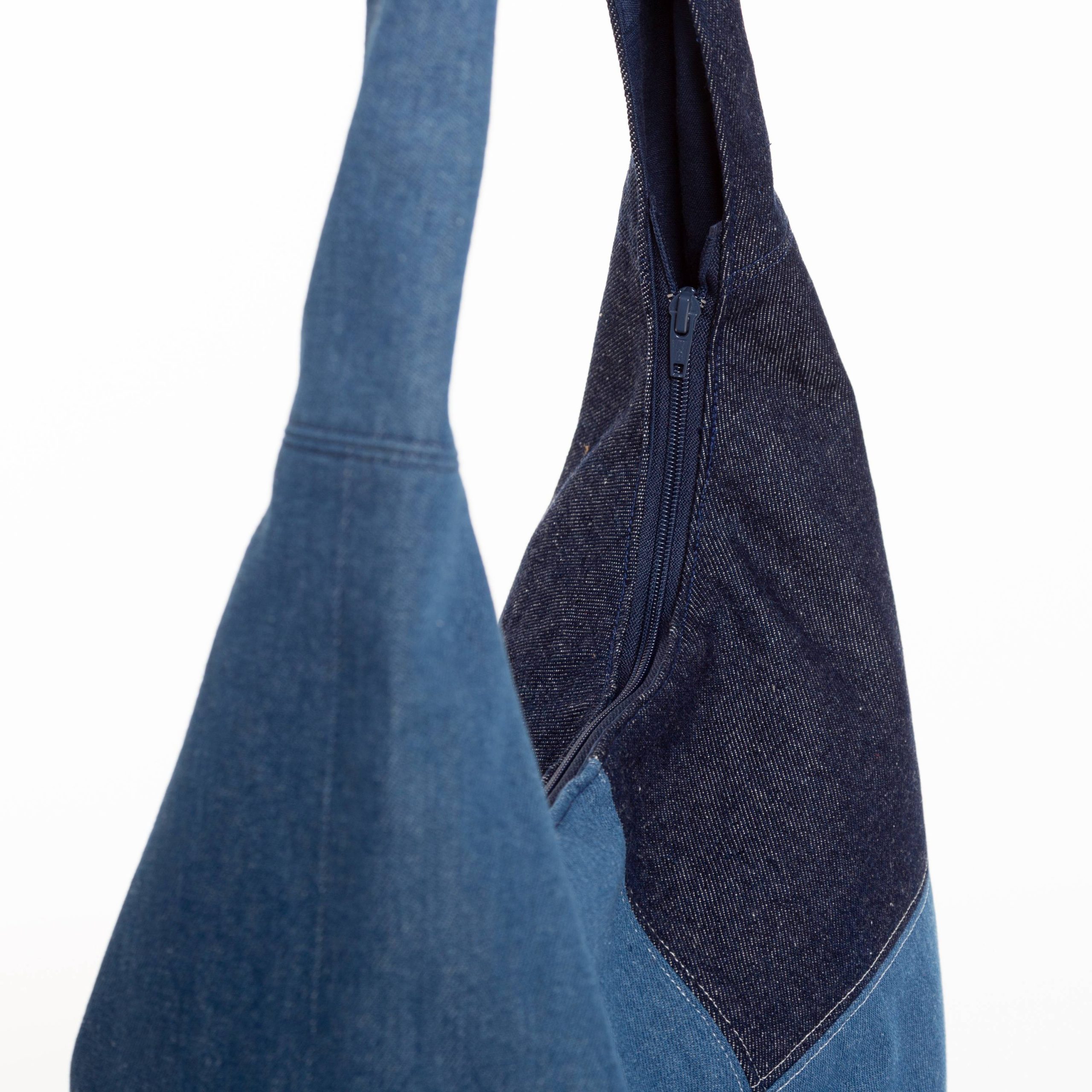 Bolso hobo hecho a mano combinando dos telas vaqueras. El modelo ESTER es un bolso de hombro flexible, ligero y muy cómodo. Es grande y espacioso para que lo puedas llevar en el día a día.