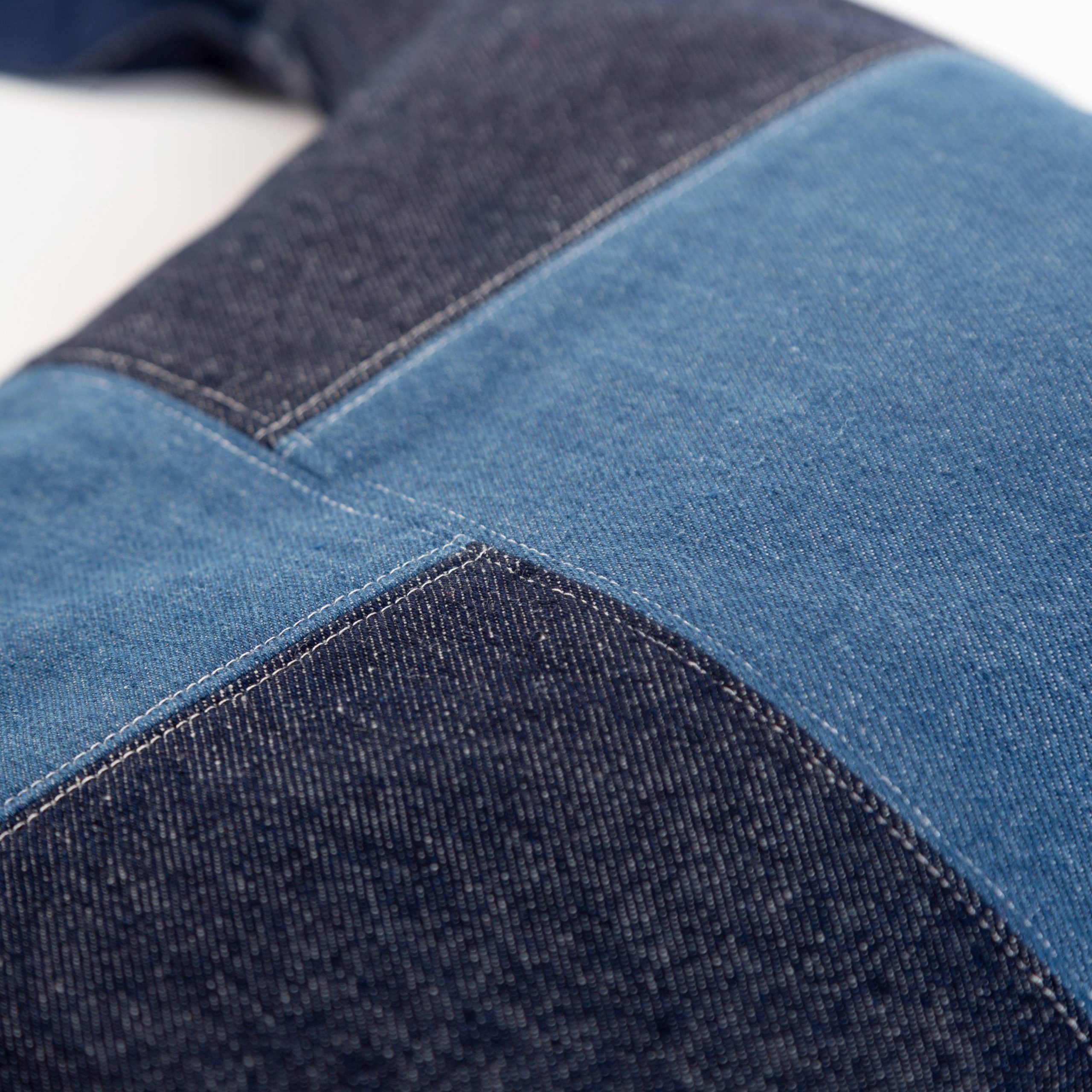 Este diseño combina dos tejidos vaqueros en diferentes tonos de azul creando un efecto de contraste. El interior está forrado con un tejido de algodón poliéster en color azul marino, lleva bolsillos a lado y lado, uno de ellos con cremallera. El bolso cierra con cremallera de nylon en azul marino.