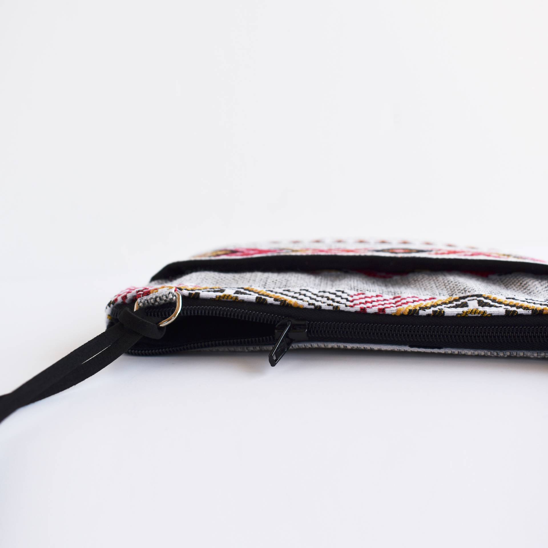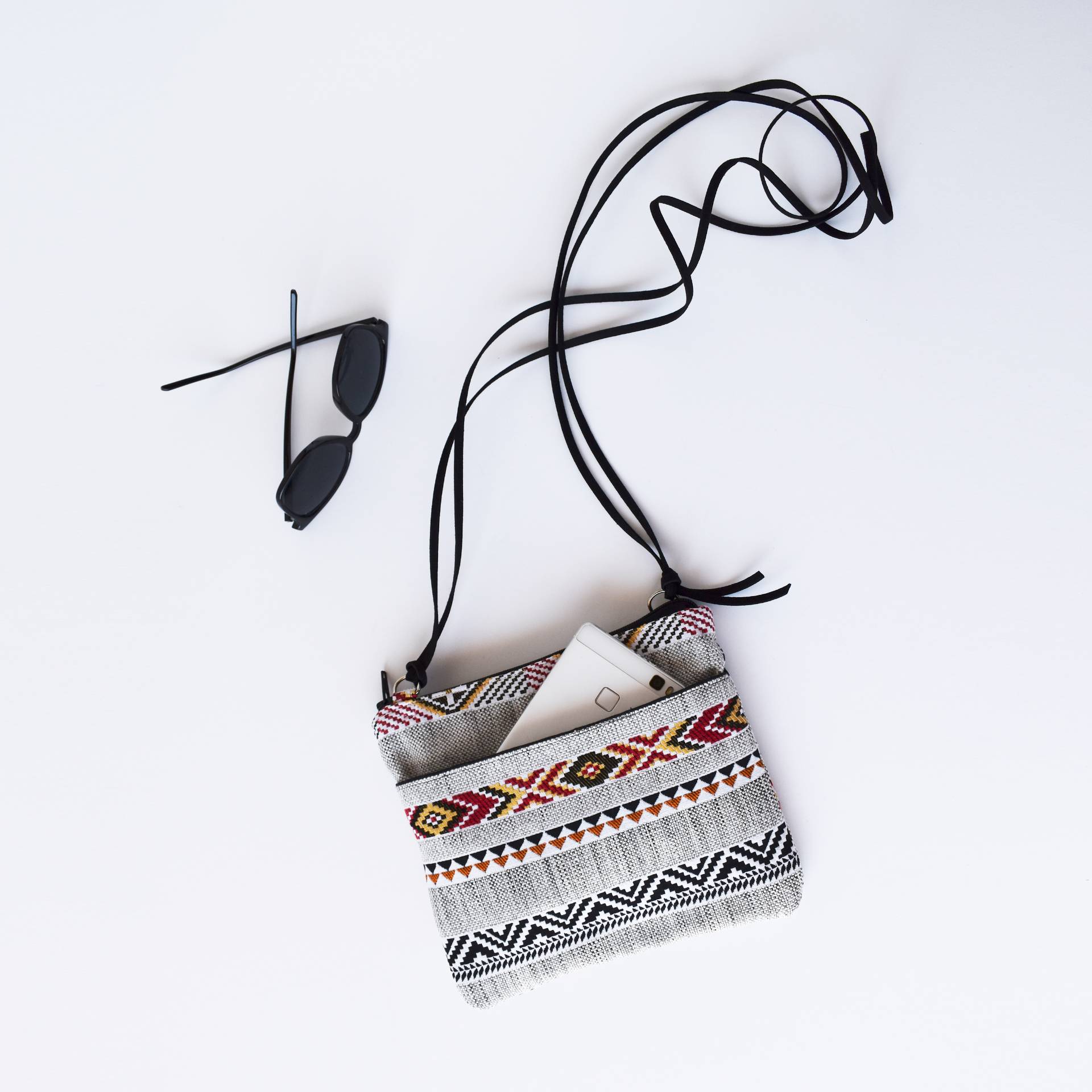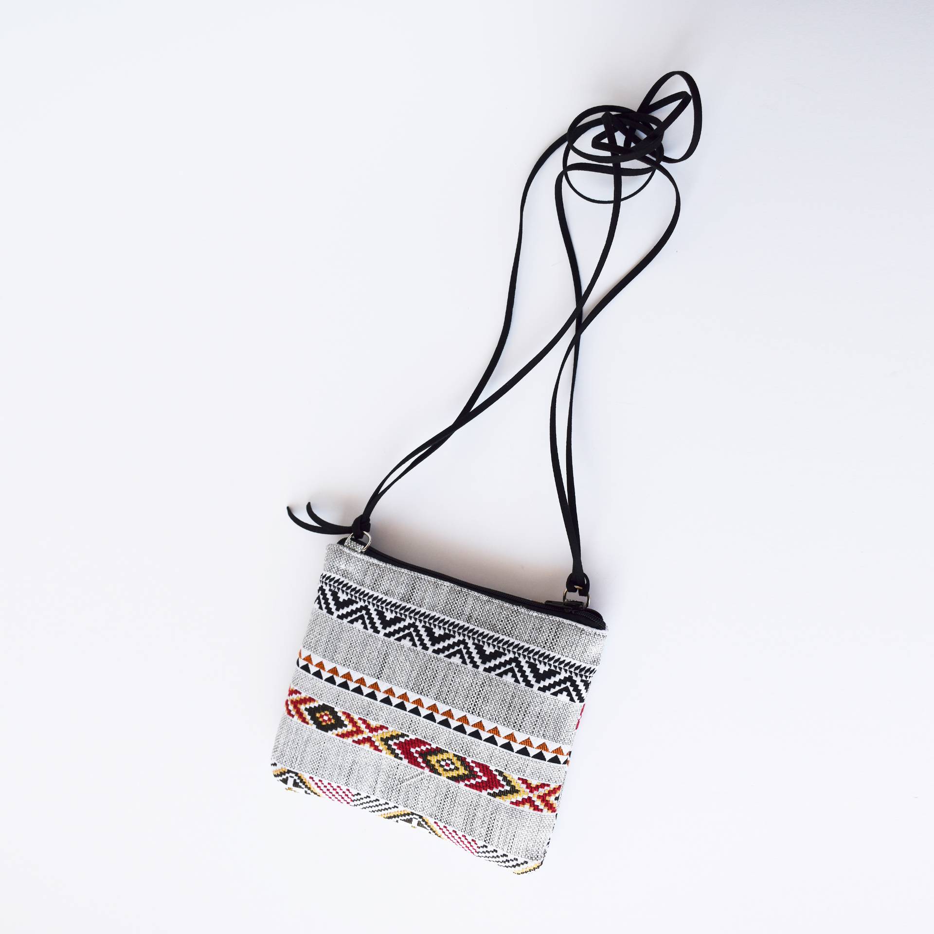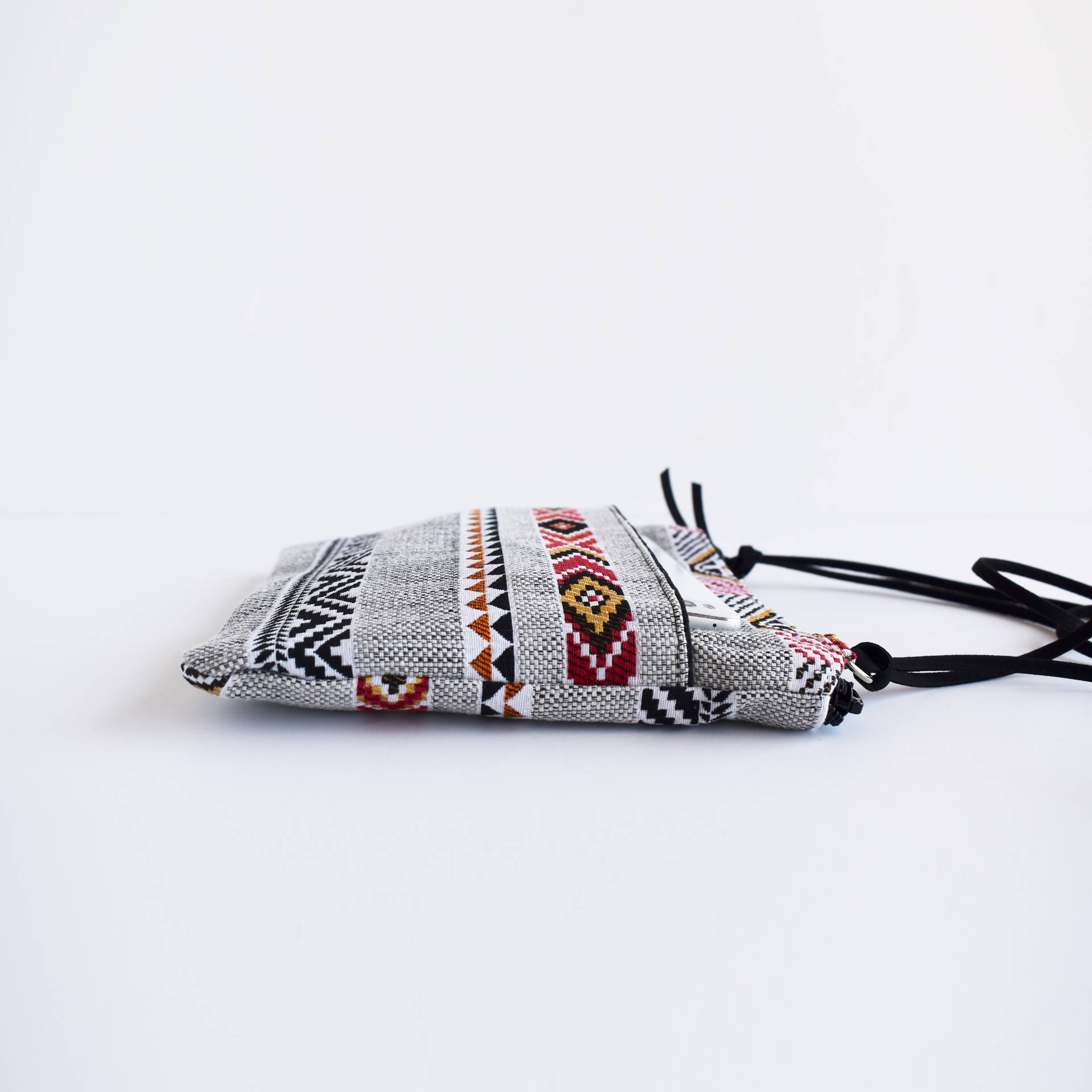 Bolso mini plano de estilo étnico hecho a mano con tejido jacquard en gris y rojo. Un bolso cruzado pequeño y ligero, ideal para llevar tus imprescindibles de forma práctica: el móvil, las llaves, las gafas de sol… Con cordón de ante que puedes ajustarlo a la medida que tú quieras.